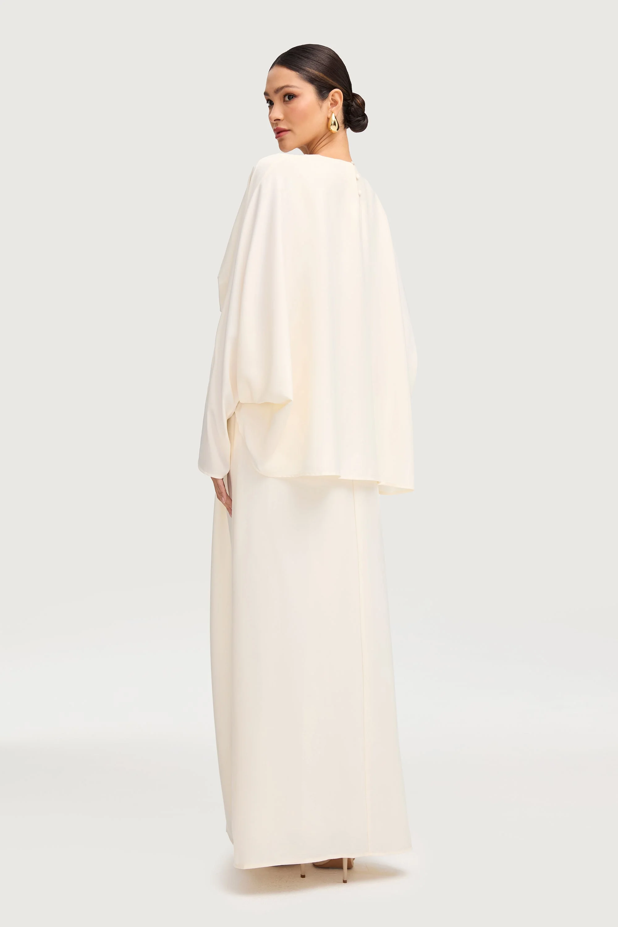 Indulge in elegance with our Maleeka Satin Drape Maxi Dress in Moonlight. The banded waist and pleated wrap front create a stunning silhouette, while the satin cape overlay adds a touch of luxury. The beautiful drape and flowy design exude sophistication and grace. Elevate your style with this maxi dress.