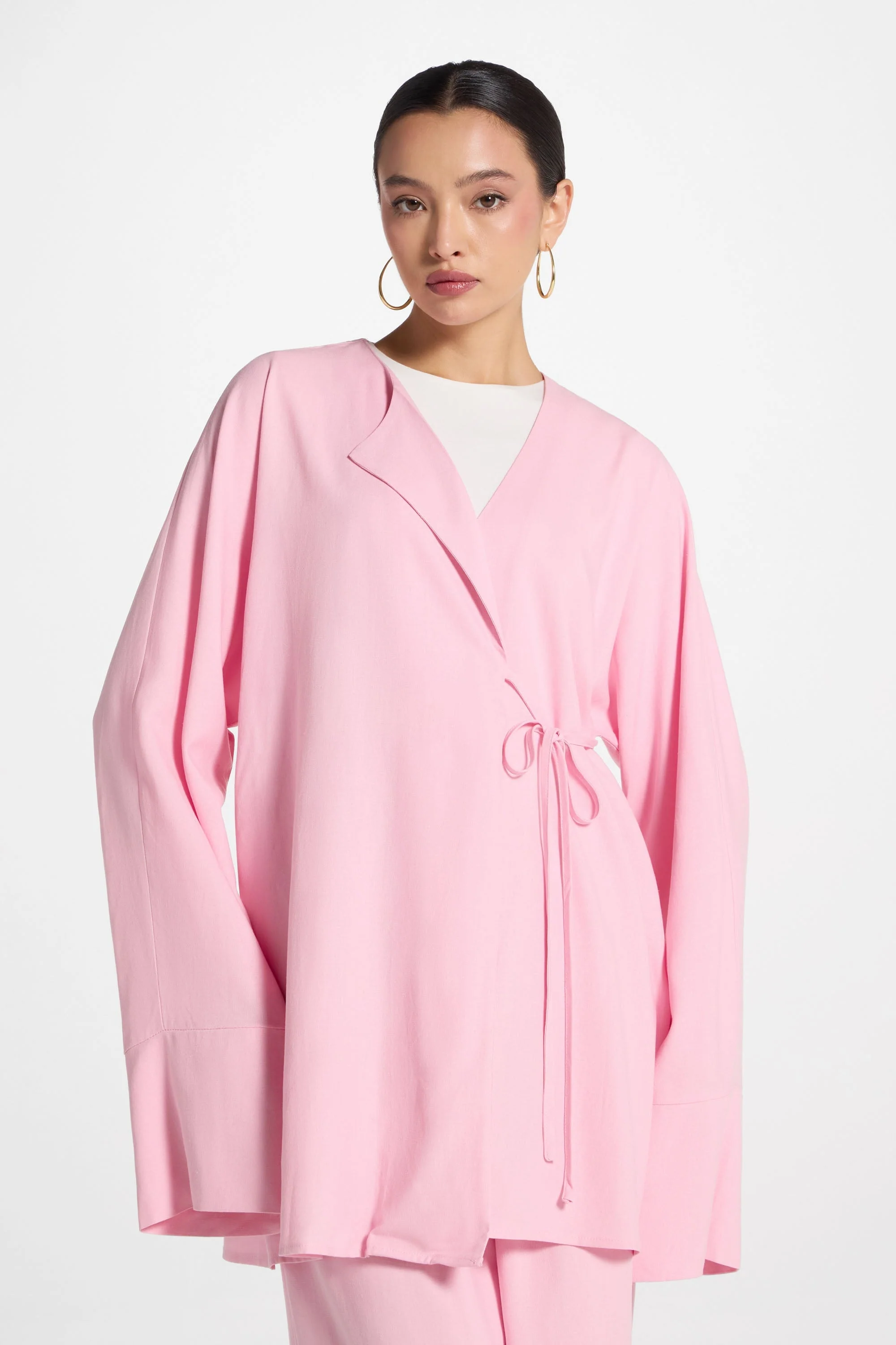 Elevate your wardrobe with the Maya Linen Matching Top & Pants Set in Summer Pink. This sophisticated ensemble features a side-tie linen top with an asymmetric collar front, offering a modern twist on classic tailoring. Paired with matching wide-leg pants, the set combines comfort and elegance, perfect for effortless style from day to night. Crafted from breathable linen, it ensures a refined look with all-day ease.