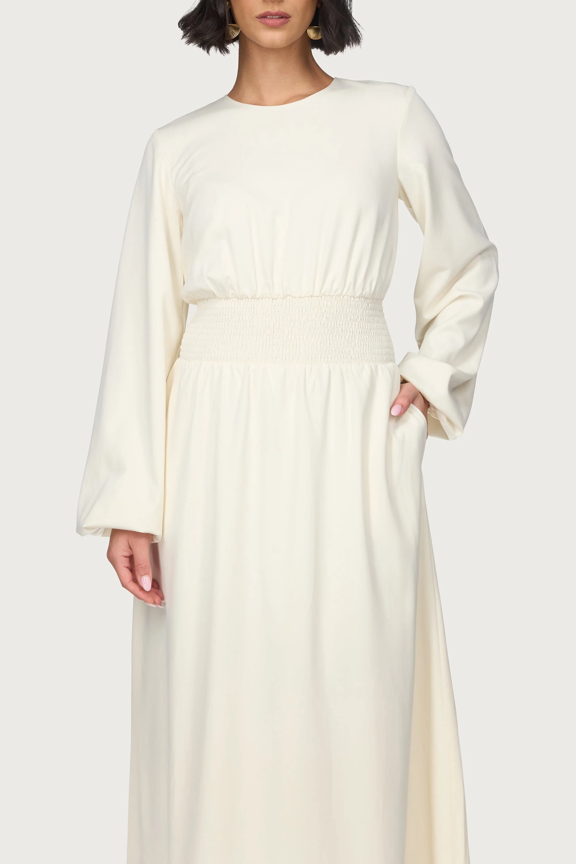 Our Smocked Waist Dress in Bone features a smocked waist that enhances your silhouette with a flattering fit. Balloon sleeves add a touch of sophistication, while convenient pockets offer practicality without compromising style. Crafted for comfort and versatility, this piece effortlessly transitions from day to evening wear.